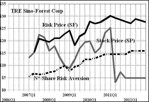 In the case of Sino-Forest, we note that the stock price increased steadily for six months after the IPO in 2007, and then began to retreat until it entered what is best described as a “trading range” below the “price of risk” (below the dark, solid line in Exhibit 1 below).