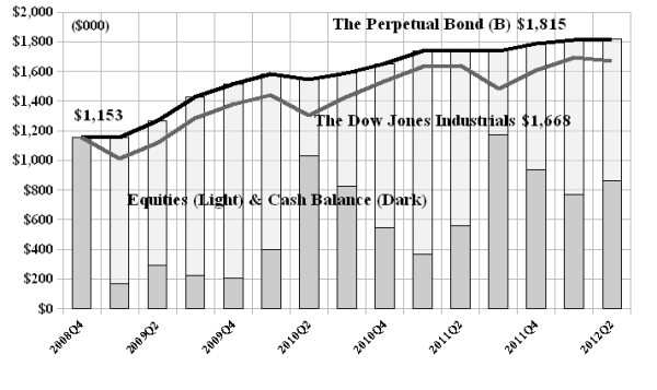 The light line is the actual value of all thirty companies in the Dow bought on the same basis (1,000 shares of each company) at the same time. The Perpetual Bond (B) also earned $83,000 in dividends over the three years ending in 2011, and the Dow Portfolio (consisting of all the stocks) earned $127,000 during that time, although neither number is included in the cash account that is shown because we wanted our buying and selling activity to be completely transparent (those facts can be verified from the tables in our previous Letter).