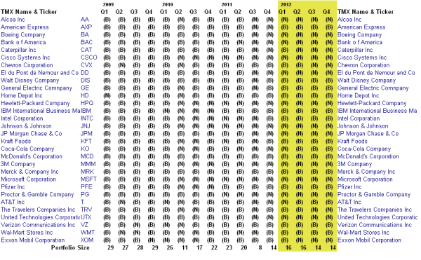 For example, in early 2009 we were willing to buy twenty-nine of the thirty companies in the Dow, but that number changed as new information became available on a quarterly basis. In late December of last year and early January of this year, we held fourteen companies and have both bought and sold two to four companies in the last six months, and currently hold fourteen (please the column for 2012Q2 and what we reasonably expect, but don’t know yet, for the third and fourth quarters).