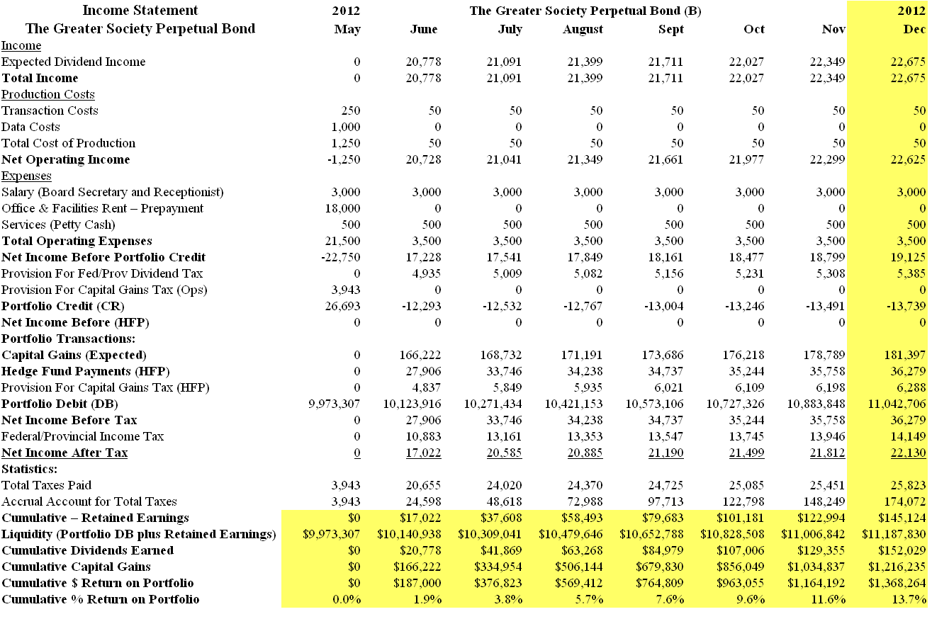 The original donor of $10 million is anonymous by preference and the Bond is expected to distribute approximately $1 million every six months in perpetuity. The simplified pro forma income statement for the Bond is below and one notes that we can reasonably expect to have $1,187,830 (Liquidity line) plus an additional $174,072 (Accrued tax account) for a total of $1,361,902 to distribute in December (the end of the first six months) while still maintaining the original capital of $10 million invested in the balance of the current portfolio.