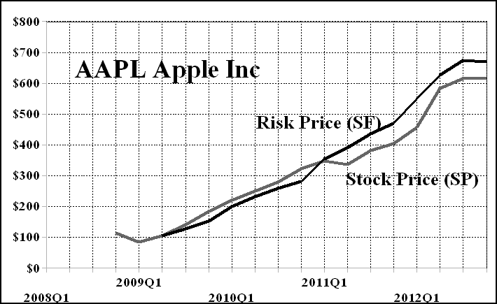 Moreover, in principle, we can’t buy Apple without a better deal because it’s an (N) (please see the chart below) and has been since $350 in April of last year (when we last sold it) and we only buy and hold (B)’s, that is, the stock price (SP) should exceed the risk price (SF). So, yes, we’ll buy the stock and we’ll buy the put, but What are you going to give us for the call? For more on this, please see one of our previous Letters such as Stock Prices Are The New Pink, June 2012.