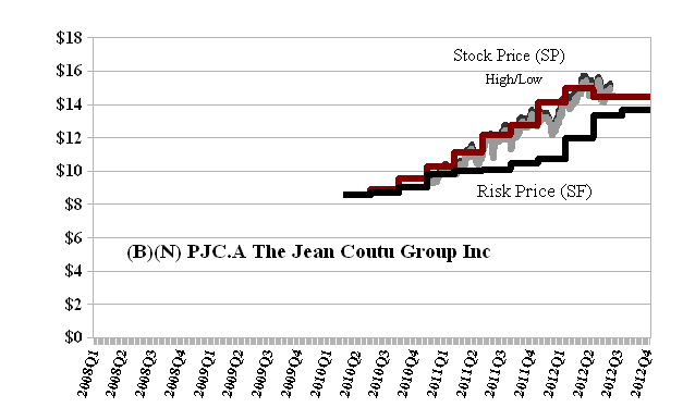 In contrast, PJC.A The Jean Coutu Group has been in our portfolio since $9 in late 2010 and is still in our portfolio at the current $14 to $15. The stock is trading at $3 above the current risk price (and is therefore in (B)) and has a volatility calculated downside of $1. We have the choice of setting a stop-loss at $14 and possibly being sold out at that price, or buying a “protective put” with strike price $14 in January 2013 ($65 per hundred shares) and at the same time, selling an opportunistic call at $15 ($55 per hundred shares) against our long position. In effect, we can guarantee $14 or more per share for next four months for the net cost of $0.10 per share now. And neither “volatility” nor the “markets” nor “earnings surprise” or anything else can change that.
