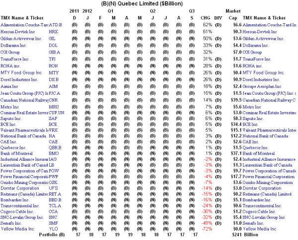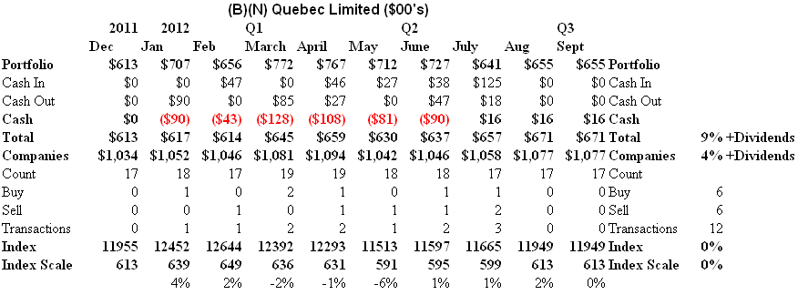 The Table in Exhibit 1 is the Cash Flow Report for the Perpetual Bond “Quebec Limited” since early January of this year. The domain for the “Bond” consists of thirty-four companies (please see Exhibit 2 below for the complete list) of which we were able to buy seventeen (Count) in early 2012 because – and only because – they were (B) according to our rules, that is, the stock price (SP) tended to exceed the risk price (SF) as far as we could tell (please see The Price of Risk, August 2012). Since then we have bought six (Buy line) and sold six (Sell line) and still hold seventeen.