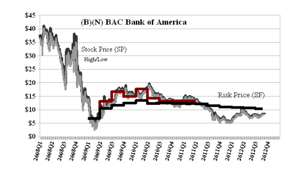 Obviously, a lot of investors thought that BAC was a bargain at $20 in late 2008 and at least some remembered to sell at $38 three months later. We bought in at $10 in early 2009 and our bought put protected the price at $18 a year later. The Stock Price (SP) then tracked the Risk Price (SF) for about a year (and we did not own it) and then dropped below the risk price in early 2011 and the risk price is also declining which “seals the deal” for us, for now and throughout 2012.