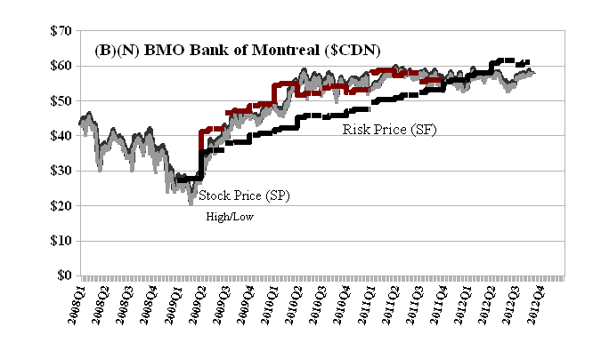 The Dark Line and Grey Zone below it show the daily high/low stock prices and the Black Line, which is a step-function and changes only quarterly as new balance sheet information becomes generally available, is the calculated Risk Price (SF). The Red Line (also a step-function) shows the Stock Prices (SP) at which we nominally bought and held or “sold” the stock with our usual “selling” discipline in force (please see, for example, (B)(N) AAPL Apple Computer Inc, August 2012, for more detail on these tactics). We only buy or hold the stock if the Stock Price (SP) plausibly exceeds the Risk Price (SF) and it is, therefore, a (B) and we “sell” on a (B)- to (N)-transition, usually with a bought put on our long position that is partially offset with a sold call of similar duration at an opportunistic price (please see, The Wall Street Put, August 2012). Based on the chart, we held BMO continuously between $28 in early 2009 through $55 in late 2011 (three years later) paying no actionable attention to market volatility during that time simply because, and only because, the Stock Price (SP) plausibly exceeded the Risk Price (SF). To execute the “sale” we were sold out on our short call at $58 in early 2012 and have not bought it since and one notes that the current risk price is $60 and above the apparent “stock price”.