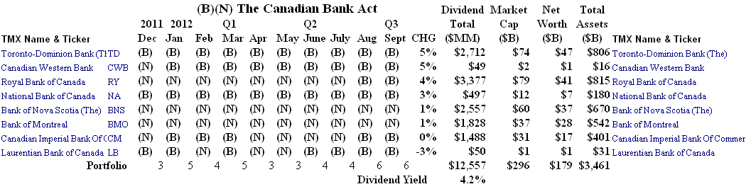 The “Canadian Bank Act” is a Perpetual Bond™ with domain consisting of the eight Federally chartered and (more or less) national banks. The RiskWerk managed portfolio of just these eight banks has returned 3% plus a 4% dividend yield so far this year and, obviously, has outperformed the S&P TSX Composite Index which has returned nothing and one sees no reason that should not be the case for the rest of the year. We’ll know, of course, in a few months but if 7% or more is good enough for us this year on just the banks then we can lock in our gains in the usual way (please see, for example, No Stock Is Forever, August 2012) and wait for Christmas.