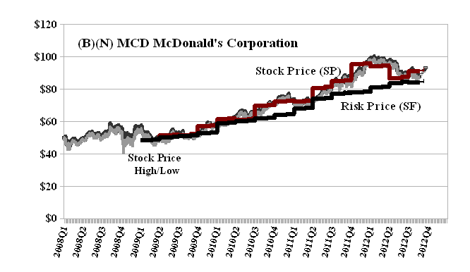 The Dark Line and grey zone below it are the daily highs and lows of the stock price. The Red Line (a step-function) is an indicator price, Stock Price (SP), at which we might have “bought” or “sold” the stock based on the comparison with the current Risk Price (SF) (the Black Line, also a step-function). A company is a (B) if and only if the current Stock Price (SP) plausibly exceeds the current Risk Price (SF) based on the known information. “Buying” is usually quite trivial – we just buy blocks at the current market price and are not overly concerned about the market capitalization weights that seem to animate so much of investment “thinking” (please see our Post, Churn, Churn, Churn, September 21012) – but the discipline of “selling” is, generally, more difficult when large blocks are involved or we might want to just keep the stock but protect our current prices and delay a decision.
