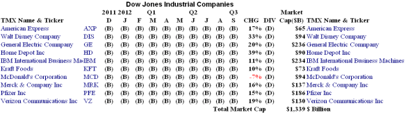 Of course, we know which of the thirty companies are a (B) in January, and for how long they’ve been a (B), but we don’t know for how long they will remain a (B) – that’s only resolved by new balance sheets as they become generally available or by breaching the known risk price which is calculated only quarterly and based only on known data. Please see The Wall Street Put, August 2012 or Popoviciu’s Volatility, September 2012, for more information on how we protect our gains on stock prices.