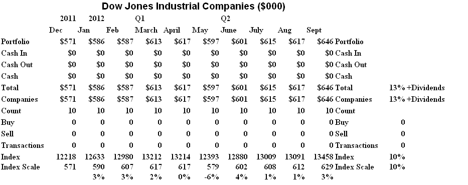 The current Quintessential Perpetual Bond in the thirty companies of the Dow Jones Industrial Companies (please see Exhibit 2 and 3 below) has returned +13% plus dividends for the year-to-date and there are no transactions required other than to buy an interest (1,000 shares in each for a total cost of $571,000 in the example) in precisely ten of the stocks (Exhibit 3) at market prices in January.