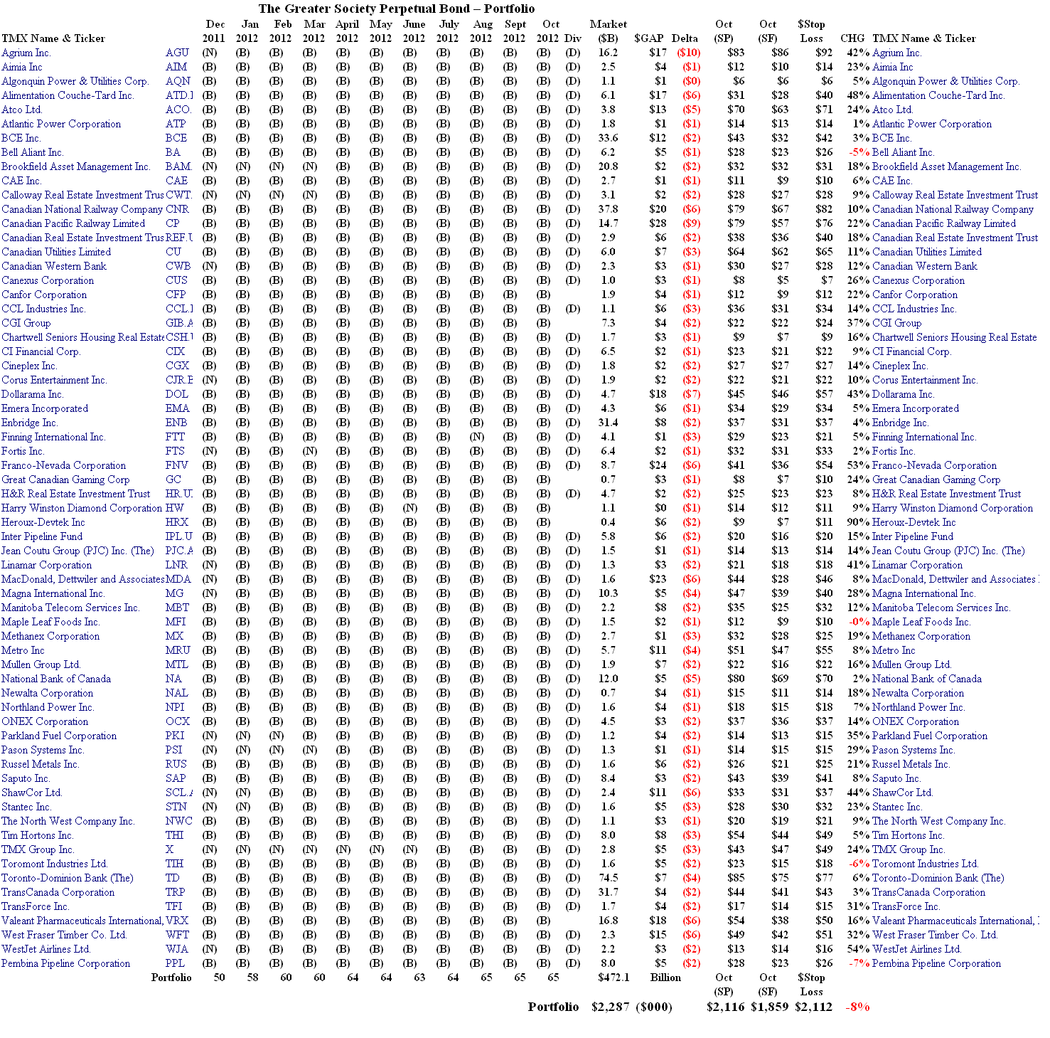 It’s noteworthy that all but four of these companies (Maple Leaf Foods Inc, Bell Aliant Inc, Toromont Industries Ltd and Pembina Pipeline Corporation) have had significant price increases this year (please see the CHG Column in Exhibit 3 and 4) but that fact has nothing to do with whether a company was a (B) or (N) in January or is a (B) or (N) now, and certainly doesn’t explain why the “market” is negative now.