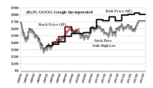 GOOG Google Inc (please see Exhibit 4 below) raised $1.7 billion in August 2004 at $85 per share which ballooned to $700 per share three years later (in October 2007) but then fizzled to under $300 in late 2008. (Who knows why.) We’ve owned it between $400 in 2009 and $650 in 2010 (the Stock Price (SP) Red Line above the Risk Price (SF) Black Line) but (perhaps unfairly) its been in the trading zone (N) since then. The current Risk Price (SF) is $800 and the current Stock Price (SP) is $700 with a volatility anticipated downside of minus ($55).
