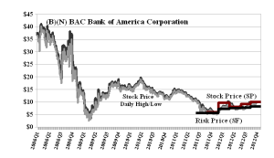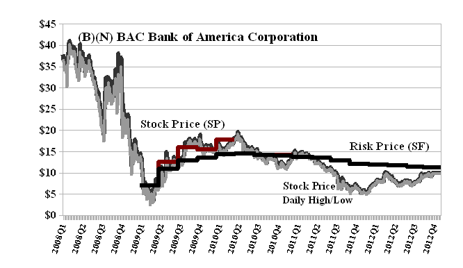 The other factors that might reduce the perception or understanding of “investment risk” are that the bank is “too big to fail” and that its management and business strategy is changing for the better. It is reasonable (and mandated by the theory) that we should “calibrate” the Risk Price (SF) to the lowest stock price if, in fact, the new Risk Price is “validated” by the subsequent market prices post $6 in 2011 which it appears to be (please see Exhibit 3 below).