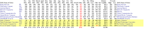 The Perpetual Bond™ on the other hand is at +10% now plus an additional 2%-3% of dividends this year – and we can’t do any worse than that until the end of the year because of the stop/loss and option positions. The Perpetual Bond™ selected sixteen of the thirty companies of the Dow in early January and trimmed that back in the course of the year to the current nine as companies dropped out (and appeared to be affected by something more than just volatility) and we took profits by selling our positions. Four more companies (Bank of America, United Technologies, The Travelers Companies and Proctor & Gamble) could be included in the 2013 Bond.