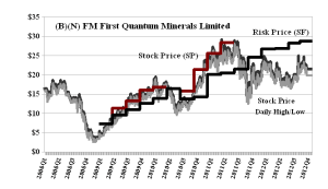 However, the offer is not in cash but consists of C$2.461 billion in cash and up to 112.679 million shares (113 million) of common stock in First Quantum issued from treasury and valued at the current market or trading price of about $21.50 and, therefore, $2.4 billion. But the current Risk Price (SF) for First Quantum is $29 (and has also been rising, please see Exhibit 2 below) so how is the risk-adjusted shortfall of $8 per share to be recovered or compensated? To put it another way, there’s $900 million ($8×113 million shares) on the table that is likely to go in and then go out of the pockets of ex-Inmet shareholders in the future – possibly the near future – if the deal is accepted as proposed. (Please see our recent Post, (B)(N) PRY Pinecrest Energy Incorporated, November 2012, for an example of a no cash, all stock deal which further explains the meaning of the Risk Price (SF) in this context.)