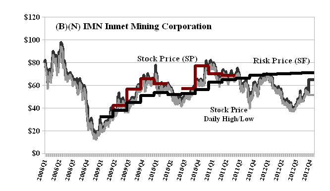 Deal Book. Inmet Mining Corporation has turned down a $70 per share friendly but unsolicited takeover offer from FM First Quantum Minerals Limited (Reuters, November 28, 2012, Inmet turns down First Quantum bid, adopts rights plan). If the offer were in cash (C$4.86 billion) then the shareholders of Inmet would be fairly compensated on a risk-adjusted basis because the Risk Price (SF) is currently also $70 to $71 (please see Exhibit 1 below) and has been steadily rising since $60 to $70 last year (2011) although one might think that the risk price is more likely to go up in the future months as more of its projects and operations are completed or developed absent the ever present possibility of disasters such as mine explosions or flooding, labour unrest or government force majeur.