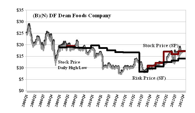 In contrast (please see Exhibit 2 below), both the stock price (apart from volatility and faint hopes) and the Risk Price (SF) of Dean Foods have been declining since 2009 until there was the beginning of a recovery (and reversal of fortune) in mid-year 2011 (less than a year ago). Nevertheless, Dean Foods currently has a market value of about $3 billion (about 1/3 of the market value of Saputo but up significantly from last year) and total assets of $5.6 billion and total liabilities of a similar amount, $5.6 billion, leaving a net worth or shareholders equity of $51 million which is up from negative (-$100 million) at the end of last year and might explain why Dean Foods must now sell Morningstar, the “cream in our coffee”, so to speak.