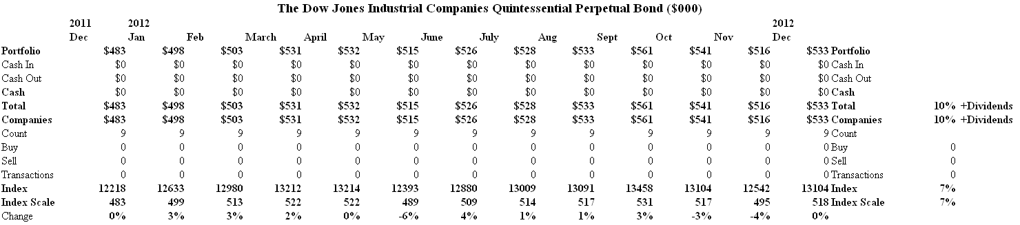 In order to do better, we need to know more and we can’t just rely on statistics and burgeoning economies to make our money work for us (and not just the portfolio manager). The Perpetual Bond™ portfolio is a managed portfolio that only buys and holds the companies that are deemed to be (B) and which are, therefore, tending to trade at or above the “price of risk” (please see our Post, The Price of Risk, August 2012). Using that rule, we bought only twenty (Count line) of the thirty companies in the Dow in late December of 2011 and early January of 2012 for a cash outlay of $1,250,000 (Total line) and obtained a return of +6% in capital gains and an additional 2% to 3% of earned dividends AND we also obtained 100% Capital Safety and 100% Liquidity using our usual buying and selling discipline (please see our Post, The Wall Street Put, August 2012, or any of the (B)(N) company or portfolio descriptions).
