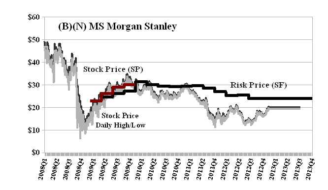Morgan Stanley is also a publicly traded company with about $330 billion in assets under management (AUM) and net worth or shareholders equity of $62 billion or 20% of the AUM in contrast to Legg Mason which has a net worth of about $5.5 billion or less than 1% of the AUM. However, the business models are substantially different because Morgan Stanley is not just a wealth or asset manager but also an investment and merchant bank that takes an active interest in share flotation (normal course and IPOs) and mergers and acquisitions and restructuring. The company pays a current dividend of $0.20 per share or $395 million per year for a current yield of about 1%. The current Risk Price (SF) is $24 and the ambient stock prices are $20 with an indicated volatility of $2 per share (please see Exhibit 2 below).