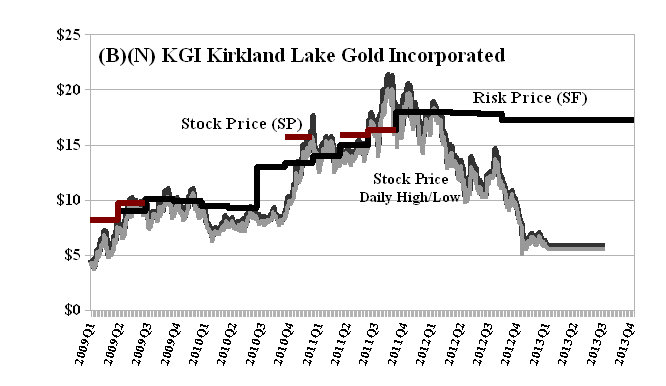 The last time that we bought and held Kirkland Lake Gold (please see Exhibit 1 below) in a Perpetual Bond™ was between $16 and $20 for nine exciting months in 2011 when we were sold out on a short “call” against our long position. (Oh well.) Moreover, we can’t buy it now even at these “low, low prices” no matter how much confidence we have in the management to move nearly 100 tons of gold-bearing ore to extract 2 lbs of gold. The Risk Price (SF) remains firmly at $18 (Black Line in Exhibit 1) and is well-above the ambient stock prices. The company doesn’t pay a dividend and our estimate of the downside volatility in the stock price is minus ($2.50) and the only options that are available for the next six months are puts and calls at $6.