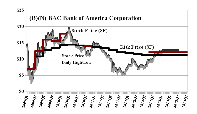 Because of our usual investment prudence – it’s our money, isn’t it – we missed a lot of the drama and also a lot of the profits for those investors who were prescient enough, or lucky enough, to load up on these stocks a year ago at much lower prices (JPM from $30 in 2009 to $50 now, and BAC from $6 to $13 or so, and, really, nothing has changed. Please see below.). But, we’re back now as both of these stocks are trading at or above the “price of risk” which we estimate as the Risk Price (SF) (JPM $41 and rising to possibly $43 and BAC $11 and rising to possibly $12).