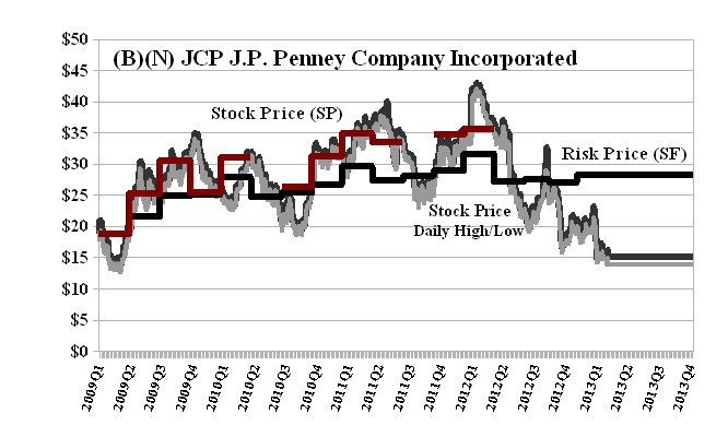 In our view, a better way to make money is not to lose it. We’ve had various opportunities to buy and hold the stock of J.C. Penney (please see Exhibit 1 below, Red Line Stock Price (SP) above the Black Line Risk Price (SF)) but sold the last of our holdings at $35 in May of last year, executing the long put that we use to protect our price in situations like this (please see other Deal Books or almost any of the (B)(N)-Company Posts), and have not been tempted to own it since. On the other hand, a defensible acquisition price for the whole company is the Risk Price (SF) which is currently $24 and places a value of $5.2 billion on the company, in contrast to the current market value of $3 billion and stock price of $14.