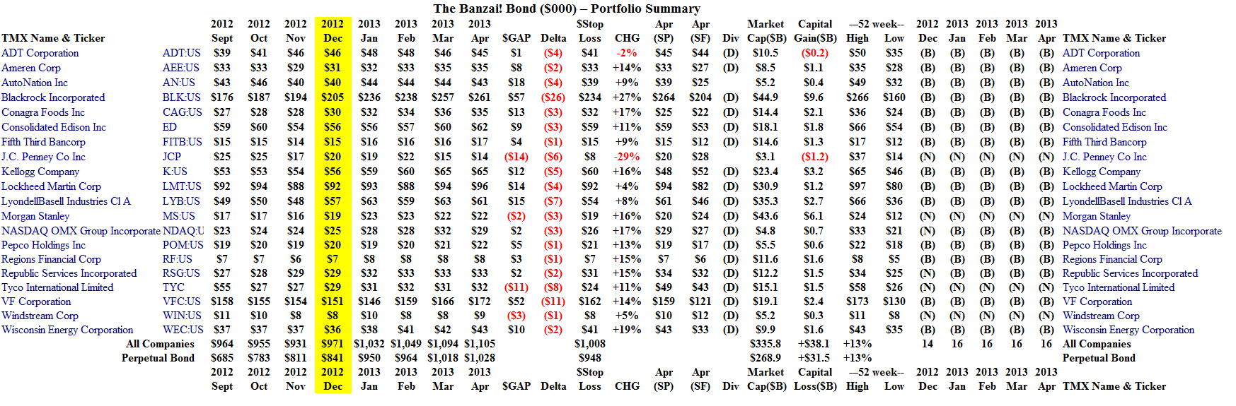 For the Banzai! Bond, we bought two more companies in January (the Nasdaq OMX Group Incorporated and Republic Services Incorporated; please see Exhibit 3 below and note the (N)- to (B)-transition in January) and the Bond currently holds sixteen of the twenty companies.