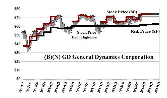 General Dynamics is one of the largest defense contractors in the United States, and one of the primary arms merchants to the world, which is a very competitive business but does not appear to be a “shrinking” . It builds the Abrams tank in Lima, Ohio, implements mobile communications systems, and owns the Gulfstream Aerospace Corporation, which is a renowned manufacturer of high-end private and corporate jets. It’s been in the Perpetual Bond™ since $65 in 2011 and the current stop/loss price is $63 which is still above the current Risk Price (SF) of $60 and rising (please see Exhibit 1 and Exhibit 5 below). It also pays a dividend of $800 million a year to its shareholders for a current yield of 3% and we’d be interested in “collaring” the stock price at between $70 and $75 through August, which we can do for a gain of $0.50 per share today.
