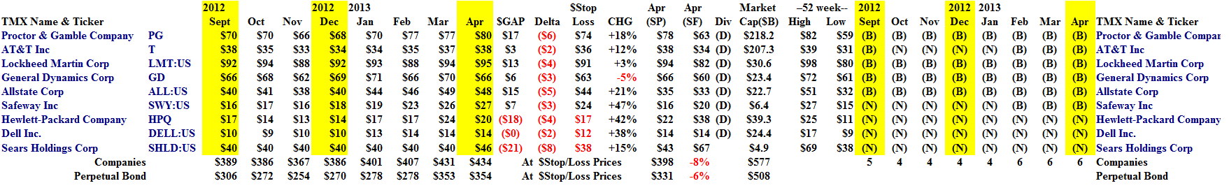 Of these nine companies, some of them are rather easy to be wary of, and the Hewlett-Packard Company and Sears Holding Corporation have also made it to another notorious list (please see our Post, America’s Most Unwanted Companies, February 2013, also from The Wall Street Journal) and the future of Dell Incorporated is uncertain at the present time and none of them are in the Perpetual Bond™ but they have returned +42% (Hewlett-Packard), +15% (Sears) and +38% (Dell) which is not something that happened because of something that the companies – which appear to be hapless – did (please see our Post,(B)(N) DELL Dell Incorporated, February 2013, and The Dow (B)-Nots, April 2013, for other situations).
