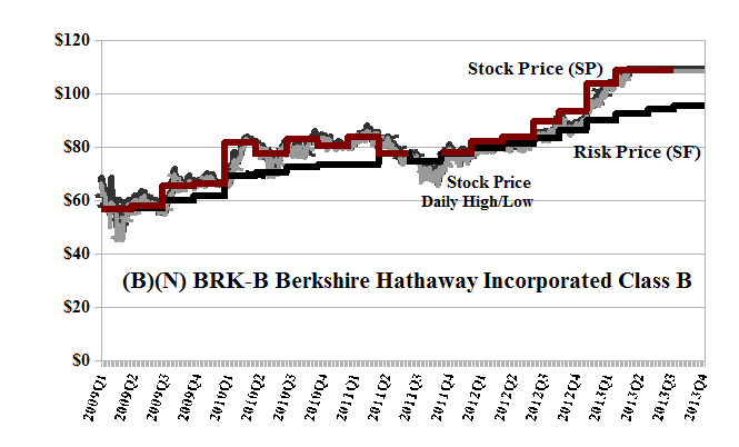 With reference to Exhibit 1 below, the Class B stock entered the Perpetual Bond™ at much lower prices of $60 in 2009 (Red Line Stock Price (SP) above the Black Line Risk Price (SF), and for no other reason) but we were sold out on a stop/loss at $85 two years later and bought it back at $78 to $80 in late 2011 and have held it ever since.
