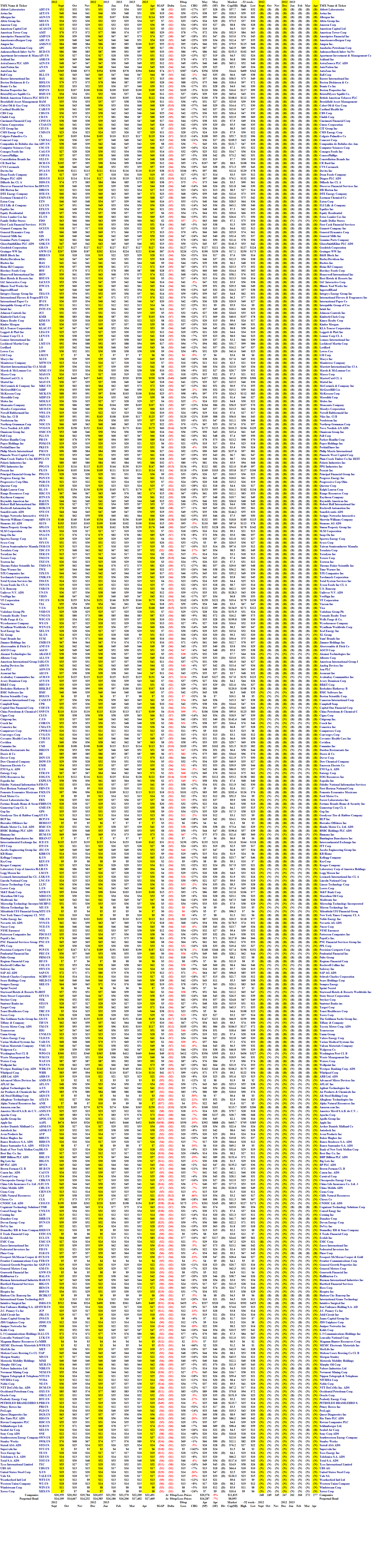 In this example, we bought 177 companies at the market price at the end of December 2011 for $9,528,000 (in blocks of 1,000; please see the Total line) and ended up with 247 companies a year later and a net portfolio value of $11,625,000 for a +22% gain on capital; if we had just bought all of the companies on the same basis, the cost in December 2011 was $17,951,000 and the current value is $20,655,000 for a capital gain of +15% (plus dividends); and the change in the market index was +12%. The Cash In and Cash Out lines summarize the selling and buying activities (respectively) from the Cash Account which shows a negative balance only if we choose to use the margin account (which we do here, for clarity) and the Total line is the sum of the Portfolio value ($14,385,000) and the Cash Account (which is negative $2,761,000).