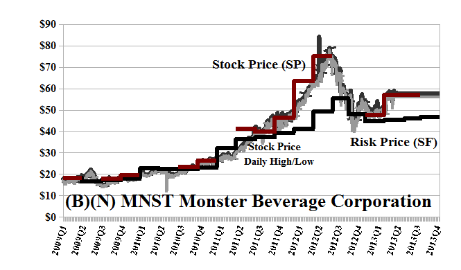 Drama. We took a ride on the Monster Beverage Corporation for one reason, and one reason only – its stock price was trading above the price of risk and we rode it from $40 in 2011 to $80 last year, in June 2012; and then we went for a coffee break, saved by our stop/loss at $70 (please see Exhibit 1 below).