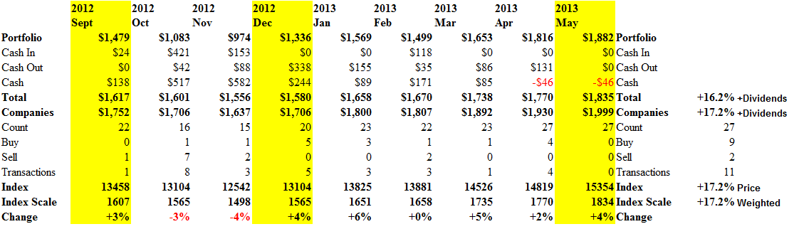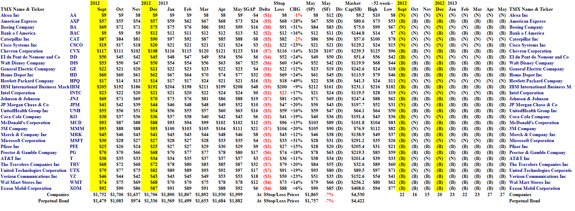 The Perpetual Bond™ in the thirty companies of the Dow Jones Industrial Companies currently has 27 companies in it, all but Alcoa, Caterpillar and Hewlett-Packard (which we’ve discussed in previous Posts; please use the Search box to track anything that we talk about that might not be familiar); and we’ve made 9 buys and 2 sells in the portfolio since December, always in blocks of 1,000 shares for the purpose of this report (please see Exhibit 1 and 2 below).