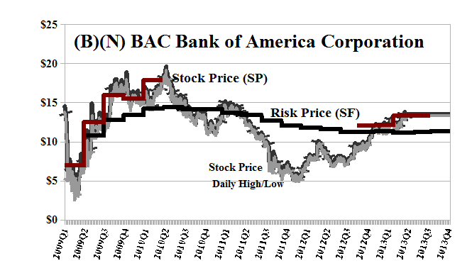 Our downside estimate for the stock price of the Bank of America is minus (-$1.75) so that we would not be surprised by any price between the current $13 and $11 or $15 during the next several months. (For the details of that handy calculation, please see our Post, Popoviciu’s Volatility, September 2012.)
