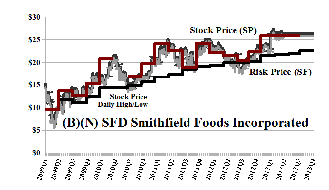 Deal Book. China’s Shuanghui International Holdings Limited has concluded a deal to buy Smithfield Foods Incorporated for cash at $34 per share and a total cost of $4.7 billion (The Associated Press, May 29, 2013, China’s Shuanghui buying Smithfield Foods for about $4.72 billion, taking company private). That’s a +30% premium over the current stock price of $25 and a +60% premium over the current Risk Price (SF) of $23. Please see Exhibit 1 below.