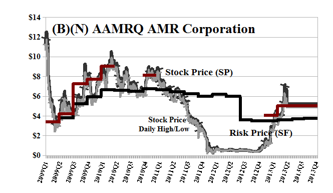 Our understanding of the situation would then be that the institutions reasonably expect that the US Airways model will be the winner; and that many small shareholders began buying AMR at the bargain prices of $0.50 per share last year and are now holding a $5 stock and waiting for the takeover price (which, would be fairly set at the Risk Price (SF) of $4).