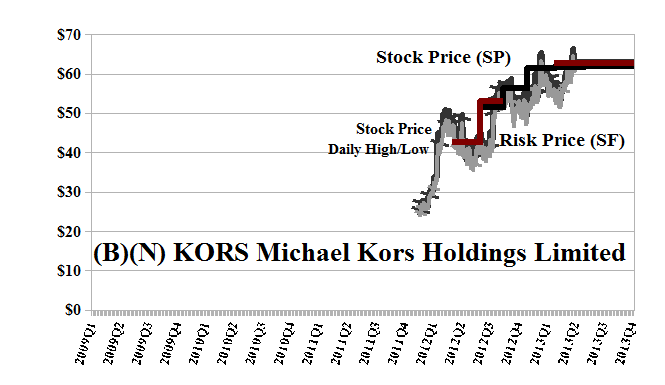 Michael Kors made its debut in New York at $24.25 in December 2011 and ran to $48 by the Spring of 2012. We picked it up at $44 later in the year and were called out at $54 six months later. It doesn’t pay a dividend, has sales of about $1.4 billion with a 10% net profit margin, and is trading at the Risk Price (SF) of $62 which would cause us to wait, at least for now, and see how the price matures, so to speak.