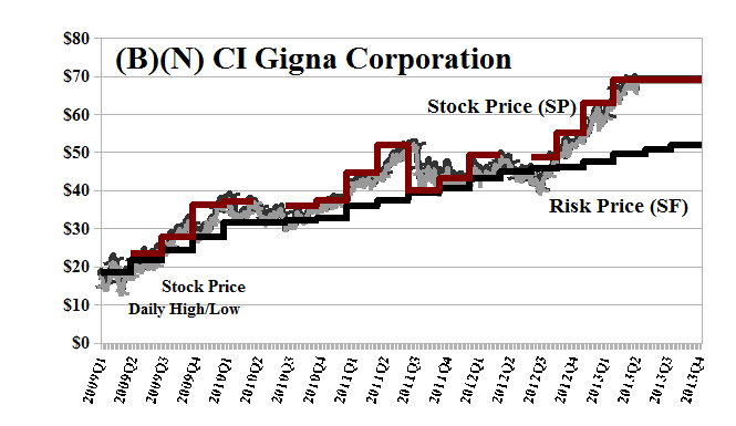 Similarly, we’ve owned Cigna at various times (please see Exhibit 2 below) but most recently since June of 2012 at $48 and we still have it now and for the same reason; Red Line Stock Price (SP) above the Black Line Risk Price (SF), and for no other reason.