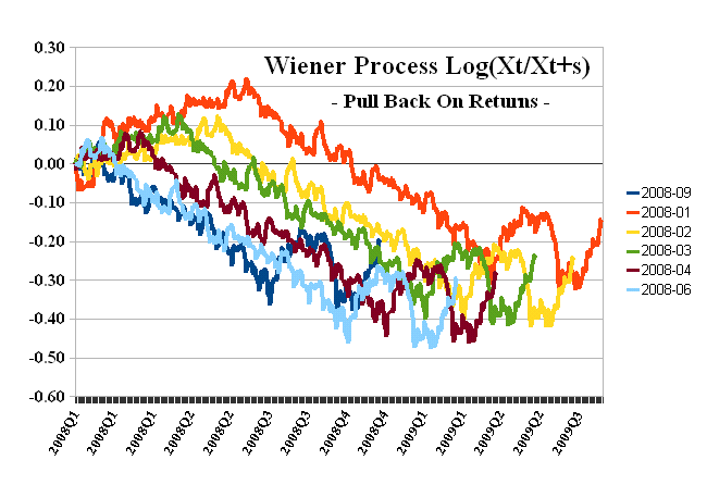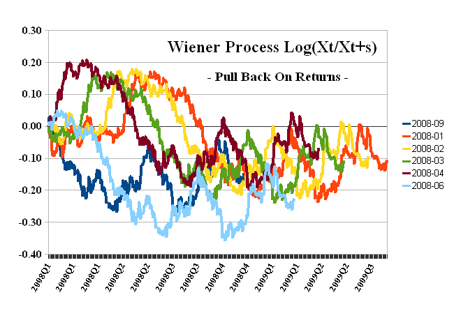 For example, the dark blue line at the top is the log ratio of prices post the closing price in July, 2010, and the others are a series from the first six months of 2008 through to 2010 and later, all brought back to the initial point at 0=log (Xs/Xs).