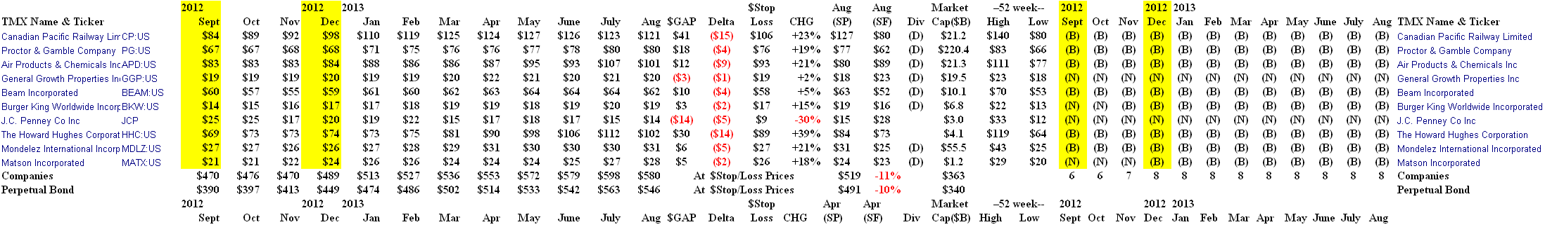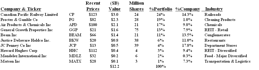 These are obviously large positions in only ten stocks and, in most cases, a significant ownership interest in the common stock of the company. Mr. Ackman is apparently trimming his holdings in the Canadian Pacific Railway Limited to about $2 billion at the current prices, and he anticipates nearly a year to pull out $1 billion without unduly affecting the stock price; and he’s recently sold his remaining interest in J.C. Penney Company Incorporated, which is currently trading at $13 and down from his purchase price of $20 to $28 three years ago (ibid, TheStreet) but has also sparked the interest of another large investor (Reuters, August 15, 2013, Soros raises JC Penney stake but two big investors exit in Q2); and he’s said to be selling his interest in the major snack and packaged food distributor, Mondelez International Incorporated of Dearfield, Illinois.