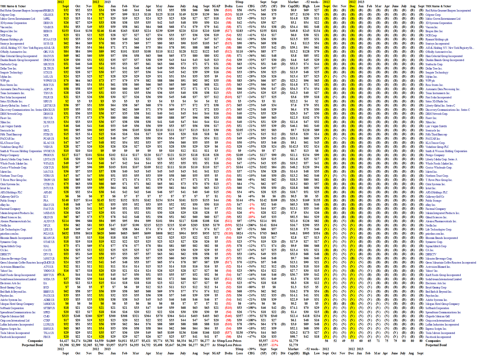 The other reason is that nearly half of them are up in excess of +30% this year; only about half of them pay dividends; and some of them are up +400% (Tesla Motors), +200% (Netflix and Softbank), +100% (Green Mountain Coffee, Ctrip, and Red Robin Gourmet Burgers), and another dozen or so are up +50% this year.