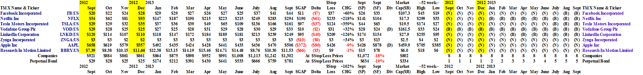 Five of these stocks are still in the Perpetual Bond™ (please see Exhibit 1 and 2 below), but a lot of people will be disappointed to know that three are not in the Perpetual Bond™ now, and never have been all year; these are Apple(-9%), BlackBerry(-1%), and Zynga(+34%).