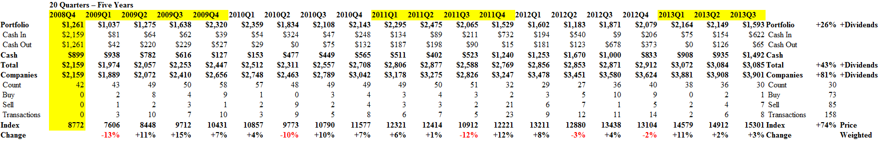 What the investors saw is a portfolio that quarter-over-quarter varied between +10% and -11%, and if they followed the practice of “buy low, sell high” on a quarterly basis, their cumulative return over five years is +2% every three months; and when four quarters are consecutively managed that way, and we respect the annual “oil change” for year-end tax selling and the “January effect”, for example, their cumulative return over five years drops to +1% over every three months.
