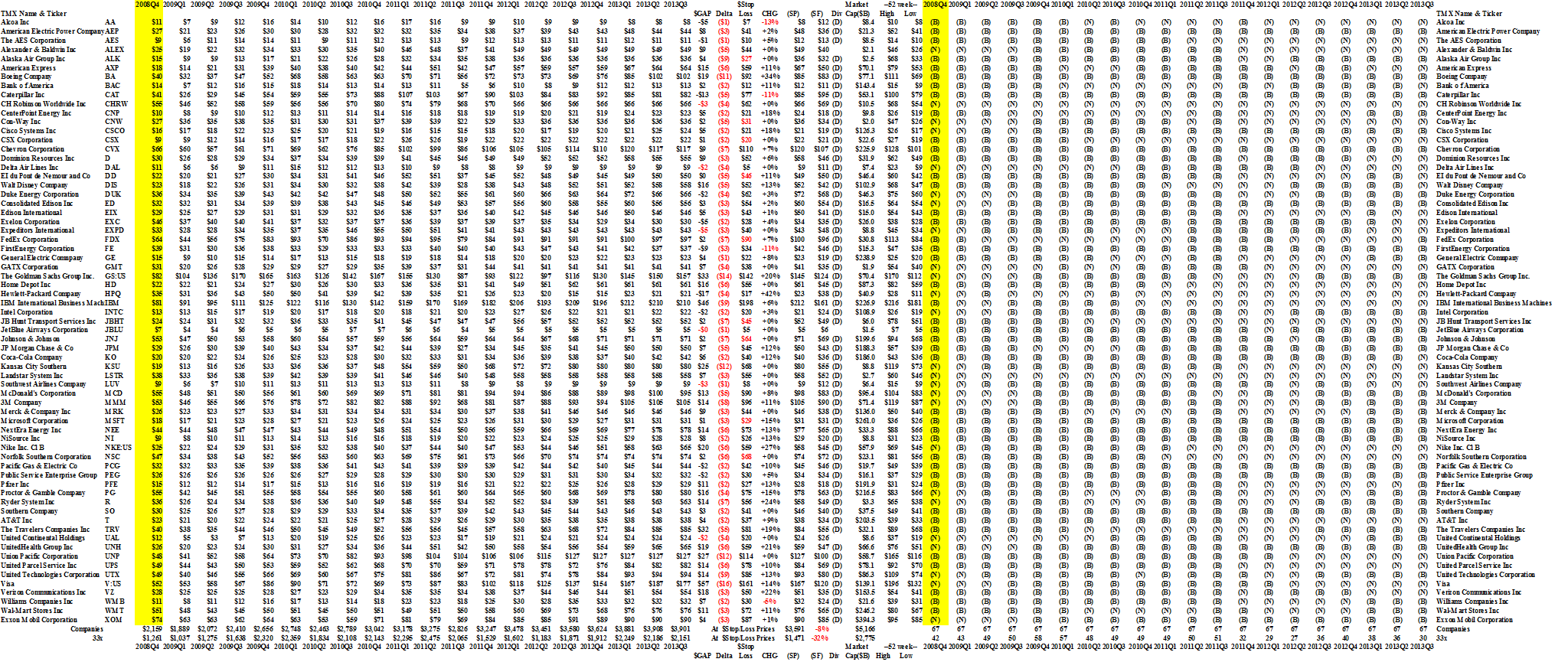 In order to cut some wood, and wade through this forest of ifs and shoulds, we ran the paradigm against the Dow Jones NYSE companies, including the industrials, transports and utilities (67 companies over the most recent five years, with a combined market value of $5.2 trillion) and the NASDAQ 100 companies (with 125 companies and a market value of $2.8 trillion) on a portfolio basis.