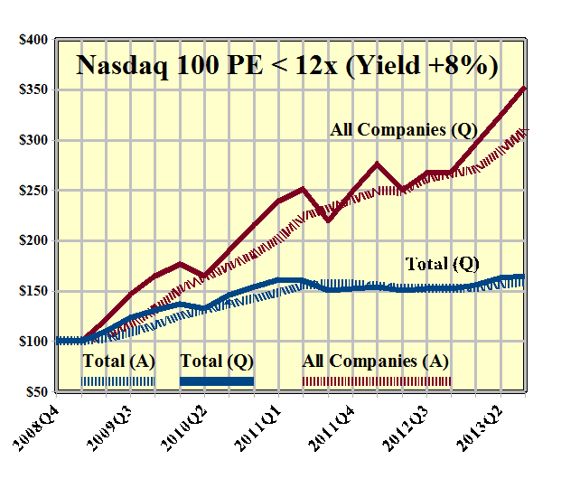 With reference to Exhibit 3 and the Cash Flow Chart in Exhibit 4, below, the passive buy/hold portfolio of 1,000 shares in each company, regardless of price differences, cost $2,709,000 in December 2008 and early 2009, and is currently worth $9,585,000 for a gain of +254% (plus dividends) in five years (Companies line in Exhibit 4).