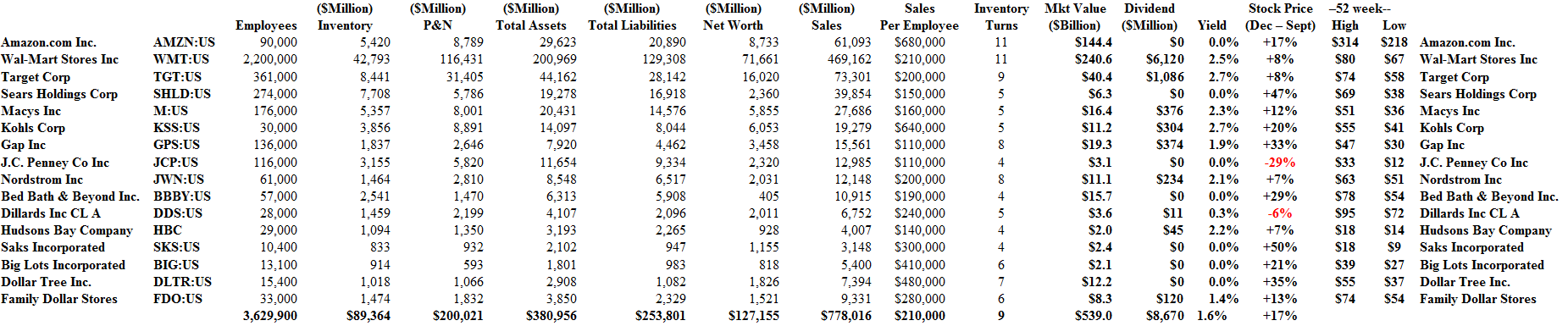 The reason that the portfolio is no trouble at all is not that we have any insight into the retail business from a consumer, operational or financial point of view. Based on the fundamentals (please see Exhibit 1 below), no combination of size, presentation, business model, debt leverage or gearing to equity, sales per employee, or inventory turn, or dividend policy, can be used to explain their stock prices.