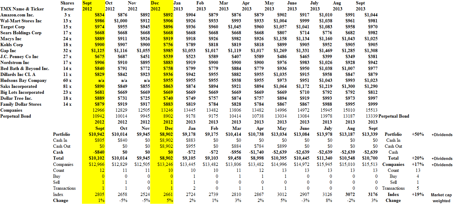 Because the number of companies is small (only sixteen) and there are large differences in their prices, we spent more or less the same amount of money on each stock (in December and early January) by varying the number of shares purchased using the “Shares Factor” which is calculated from their average stock prices in the nine months preceding September 2012.