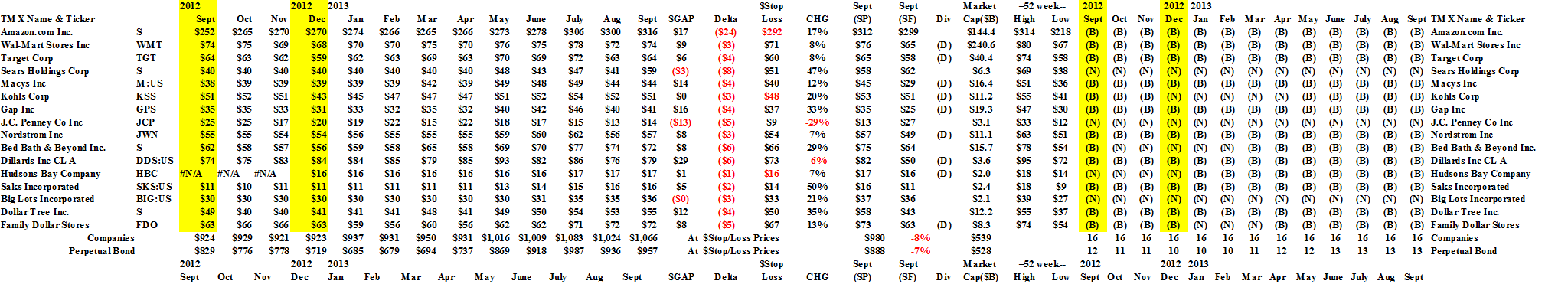 Exhibit 2 above shows the ambient stock prices of the companies in the portfolio domain since September last year and the (B)(N) status of each of the companies at those prices, and prices near to them, allowing for the demonstrated volatility of stock prices.