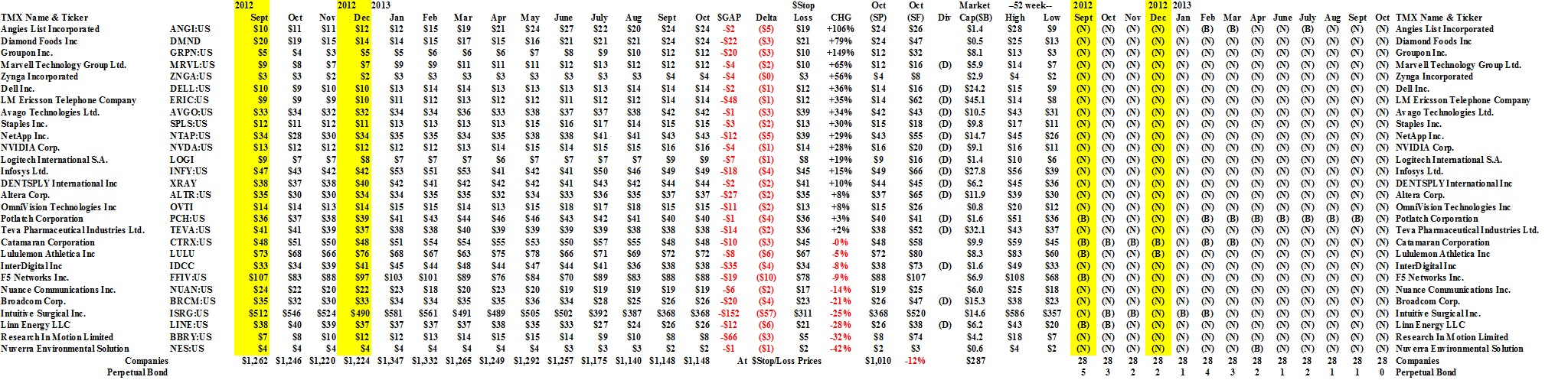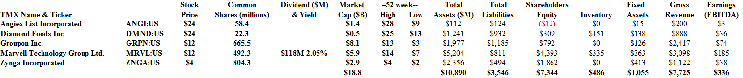 Drama. There are five companies in the NASDAQ (not necessarily in the 100) that have had double- and triple-digit returns this year for no apparent reason. The anointed five are: Angie’s List (+106%), Diamond Foods (+79%), Groupon Incorporated (+149%), Marvell Technology Group (+65%), and Zynga Incorporated (+56%).