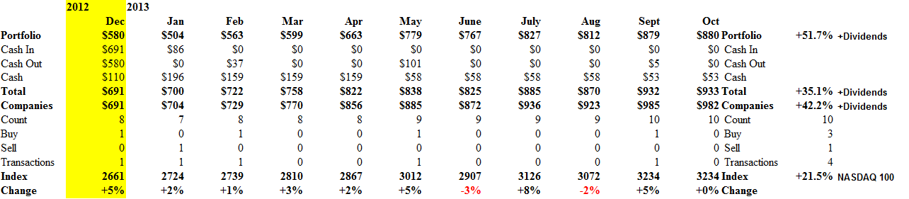 This portfolio sold for $580,000 (or million) in December whereas buying them all cost $691,000 (Companies line). It currently has ten companies in it and is worth $880,000 (Portfolio line) for a gain of +52% so far this year.