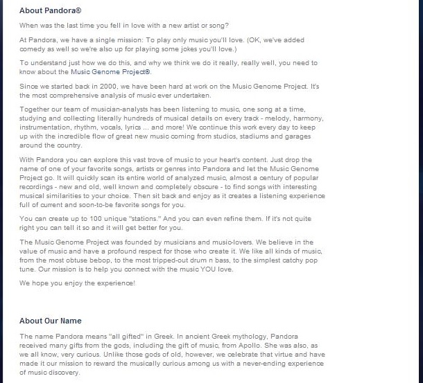 Drama. Although it is an over-simplification, we can say that the radio search-machine, Pandora Media, does for music on the radio what Google does for search in the media. Instead of “key words”, we have “key notes” that are used to develop personalized play-lists for the user.